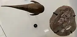 As with all other antiarchs, Pterichthyodes had heavily armored heads and forebodies, while their scaly tails were unarmored. Specimen length ranges from 8 inches (20 cm) to 12 inches (30 cm).[1] As placoderms, they were members of the earliest known vertebrates to possess jaws, though they had grinding plates rather than teeth. The generic name of Pterichthyodes refers directly to their odd wing-like appendages ("pterichthys" being a compound crassis word from Ancient Greek for "wing-fish"), which correspond to and were derived from the pectoral fins seen in modern fish and other non-antiarch placoderms. Fossils of Pterichtyodes showing eyes positioned on the direct of the head and a "ventrally flattened trunk shield" suggest that it was a "bottom dweller", living at the bottom of lakes, where it might have crawled using its pectoral appendages.[1] It has also been theorized that Pterichthyodes and other antiarchs used these appendages to bury itself.[2]
