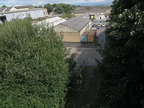 ![]() Site of the former Pudsey Greenside station in January 2016, looking east from the bridge of Carlisle Road | |||||