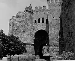 The gateway has also been known as the Puerta de la Judería[1] or the Puerta del Socorro,[2] and it is located on the south side of the walls of Segovia.[1] It has two towers, one square and one polygonal, an arch, a gallery of irregular windows, loopholes, cornices, pyramidal battlements and heraldic shields.[3] It is located in a strategic position overlooking the Río Clamores.[3] It has been speculated that its construction could have been carried out by the master stonemason Juan Guas.[4]