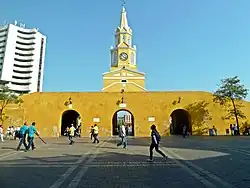 The Puerta del Reloj (pronounced [ˈpweɾta ðel reˈlox]), Torre del Reloj (pronounced [ˈtore ðel reˈlox]) or Boca del Puente (pronounced [ˈboka ðel ˈpwente]) is the main city gate of the historic center of Cartagena de Indias, in Colombia and the original entrance of the fortified city. It is located between the squares Plaza de Independencia and Plaza de los Coches. The name "Puerta del Reloj" responds to the clock with which it was crowned at the beginning of the 18th century. While the name of Boca del Puente is due to the fact that during the colonial period, a drawbridge was raised at the foot of the channel of San Anastasio, which linked the walled city to the legendary Getsemaní neighborhood. In addition the bridge served like defense of the city, since in case of enemy attack, this one was raised to prevent the access of buccaneers and pirates.