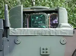 The Puma offers improvements in situational awareness. The fully stabilized 360° periscope (PERI RTWL by Hensoldt) with six different zoom stages offers a direct glass optic link to either the commander or the gunner. Since this is an optical line, it had to be placed in the turret center, one of the reasons why the main cannon is mounted off-center on the turret. Via an additional CCD camera the picture from this line can also be fed into the on-board computer network and displayed on all electronic displays within the vehicle. Besides that, the periscope offers an optronic thermal vision mode and a wide-angle camera with three zoom stages to assist the driver, as well as a laser range finder. The whole array is hunter-killer capable. The commander also has five vision blocks.