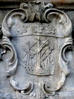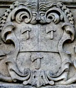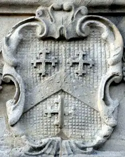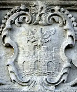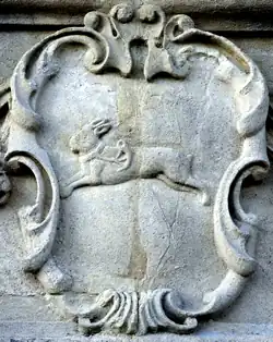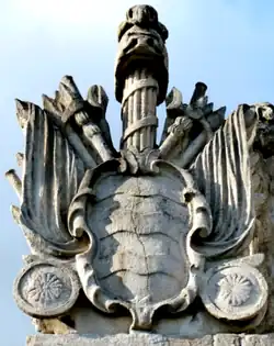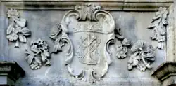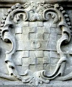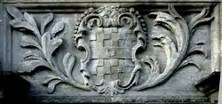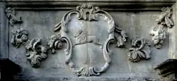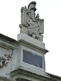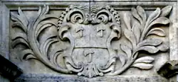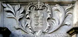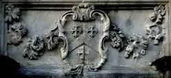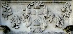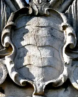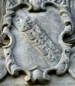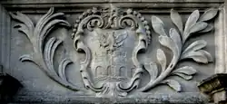 Granville: Gules, three clarions or. For George Granville, 1st Baron Lansdowne of Bideford (1666-1735), nephew of John Granville, 1st Earl of Bath (1628–1701) and heir male of William Henry Granville, 3rd Earl of Bath (1692-1711).[45] It is the only escutcheon with heraldic supporters, generally reserved for use by nobility, here Two winged griffins rampant or. Above the escutcheon is a baron's coronet. He is identifiable by the style of his coronet and by his motto, shown inscribed on a scroll below: Deo, Patriae, Amicis[46] ("For God, my Country and Friends"), the motto of his uncle John Granville, 1st Earl of Bath having been: Futurum invisibile ("The future is unseen").[47] The arms are not those of John Granville, 1st Earl of Bath (1628–1701), or of his son Charles Granville, 2nd Earl of Bath (1661–1701). The latter's son William Granville, 3rd Earl of Bath (1692-1711) died aged only 19 two years before the building was completed in 1713.