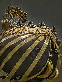 Queen Puabi's headdress is a 2600–2450 BCE Mesopotamian crown consisting of ornate gold leaf wreaths, strands of lapis lazuli and carnelian beads, with a gold comb, and delicate hair ribbons.[1] The entirety of the headdress is estimated to weigh over 6 pounds.[2] The headdress was discovered resting on Queen Puabi's remains in PG 800 during the excavation of the Royal Cemetery at Ur that began in 1922 and concluded in 1934.[3][1] Successive Mesopotamian societies built new cities on top of previous civilizations and commonly created tells (multilayer man-made mounds) to preserve human remains.[4] These younger tells (built on top of Queen Puabi's grave) hid and protected her immense riches by making them inaccessible to looters.[4] Found next to Queen Puabi's remains was a cylinder (identification) seal with the title "nin" inscribed, indicating a great lady or queen.[5] In the grave, excavators also found the remnants of female attendants – adorned in similar jewelry and hair ribbons – whose purpose was to serve the queen in her afterlife.[6] The religious significance of Queen Puabi's headdress demonstrates her royal status as well as her cultic importance.[7] The unearthing of Ur was led by Charles Woolley and was a joint expedition sponsored by the Penn Museum and the British Museum.[4] The headdress currently resides in the Penn Museum in Philadelphia. The excavation is still very popular because of the riches discovered, the uncovering of a mass grave, and the potential connection with Abraham from the book of Genesis. [4]