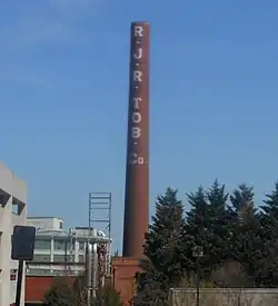The son of a tobacco farmer in Virginia, Richard Joshua "R. J." Reynolds sold his shares of his father's company in Patrick County, Virginia, and ventured to the nearest town with a railroad connection, Winston-Salem, to start his own tobacco company.[3] He bought his first factory building from the Moravian Church and established the "little red factory" with seasonal workers. The first year, he produced 150,000 pounds (68,000 kg) of tobacco; by the 1890s, production had increased to several million pounds per year.[3] The company's factory buildings were the largest buildings in Winston-Salem, with new technologies such as steam power and electric lights.[3] The second primary factory building was the oldest Reynolds factory still standing and was sold to Forsyth County in 1990.[3]