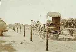 Alexander Crawford took over the maintenance of the fence from Anketell as each section was finished; he was in charge until he retired in 1922.[4] The area inside the fence to the west became known as "Crawford's Paddock". The fence was maintained at first by boundary riders riding bicycles and later by riders astride camels. However, fence inspection was difficult from atop the tall animal. In 1910, a car was bought for fence inspection, but it was subject to punctured tyres. It was found the best way to inspect the fence was using buckboard buggies, pulled by two camels.