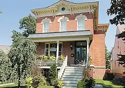 The Stephen A. Race House is a four-story Victorian Italianate residence constructed of red brick, with white limestone detailing and painted wood trim. Its form and style are inspired by the villas of Tuscany in Northern Italy, characterized by a symmetrical box shape and flat roof. The roofline is marked by large, paired eave brackets in an elaborately scrolled design, a typical feature of the Italianate style.