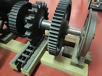 The first successful rack railway in the United States was the Mount Washington Cog Railway, developed by Sylvester Marsh.[3] Marsh was issued a U.S. patent for the general idea of a rack railway in September 1861,[4] and in January 1867 for a practical rack where the rack teeth take the form of rollers arranged like the rungs of a ladder between two L-shaped wrought-iron rails.[5] The first public trial of the Marsh rack on Mount Washington was made on August 29, 1866, when only one quarter of a mile (402 meters) of track had been completed. The Mount Washington railway opened to the public on August 14, 1868.[6] The pinion wheels on the locomotives have deep teeth that ensure that at least two teeth are engaged with the rack at all times; this measure helps reduce the possibility of the pinions riding up and out of the rack.[1]