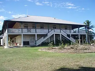 Raglan Station, located just north of Larcom (earlier Larcombe) Vale Creek in the Port Curtis hinterland, was established in 1857 by James Landsborough. The present main residence at Raglan Homestead was erected in 1913, but there are other earlier structures within the complex, including a slab hut that may date to the establishment of the station, and a c. 1886 timber cottage.[1]