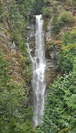 Slollicum Creek Falls is a perennial plunge waterfall located near Harrison Lake, British Columbia, Canada.[1] The falls, often mistakenly assumed to be Rainbow Falls, can be viewed without difficulty from a bridge on the unpaved East Harrison FSR below. An additional, equally tall plunge exists above the visible falls; however cannot be seen from below due to the angle afforded. Rainbow Falls itself is a separate waterfall on the same water course where Slollicum Creek discharges into Harrison Lake at its namesake recreation site. Access to this location seems to be boat only.