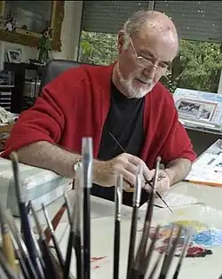 Wanting to give a new dimension to his career, he wrote and implemented in 1990 a work of art The very rich hours of Raphaël Toussaint,[11] prefaced by various personalities from the world of the arts including Paul Guth.[12] The latter writes: "Raphaël Toussaint, a naive painter? ... A problem that bothers him. In France, country of labels, we stuck this one on the overcoat. And to me too. Him, in painting, me in literature for my romantic cycle of the Naive. Labels twins. Did this naive title bother you? he asks me. I answer for both of us: yes and no. Naive does not mean silly, beta, idiotic. Naive comes from the Latin word nativus, as on the day of his birth. The naive is the one who is born every day, and the world with him. It has the spirit of childhood, one of the treasures of Saint Francis of Assisi".[13] He exhibited in numerous salons and galleries in France but also in particular in the United States (in Texas and Florida.[14] In Paris, he exhibited at Galerie 93 du Faubourg Saint-Honoré for twenty-five years, between 1965 and 1991 (gallery closed).[15] Locally, the Vendée department organized a major retrospective for his thirty years of painting (1964–1994). In 2001, the Sainte-Croix des Sables-d'Olonne museum, opens its doors to him for a major exhibition "Landscape or a certain regard". He regularly takes part in the Parisian Salons of which he is a member.[16]