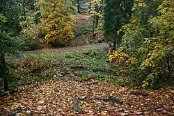 For many decades of Seattle city history, the Ravenna Park ravine had been ignored by loggers and farmers and still possessed full old-growth timber rising nearly 400 feet (120 m).[3][4][5] Most of the land was owned by mining and real estate magnate William Wirt Beck who, in addition to preserving the ravine's trees for park land, would give Ravenna its name (after Ravenna, Italy) and would plat one of the first subdivisions in the neighborhood in 1890 around the home he built that still stands East of the park at NE 60th Street and 26th Avenue NE.[6] The trees remained through the Alaska–Yukon–Pacific Exposition of 1909, at which they were featured exhibitions. Public controversy about them declined after their gradual disappearance in suspicious circumstances by 1926.[7] Today, none of that size remain anywhere in the world.[3][5][8]