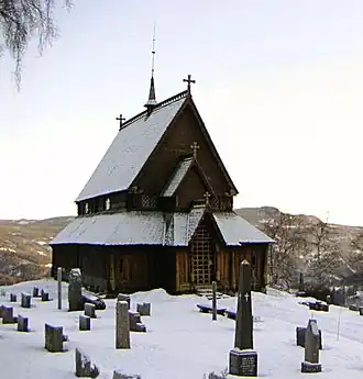 After the previous church burned down, a new wooden stave church was built on the same site. The exact age of this church is uncertain. Through radiocarbon dating, logs in the church have been dated to 1190, which somewhat contradicts previous datings of the church. Other beams in the nave date to the years 1225 and 1272. There are some claims that the church was built after 1326, but this seems to be outside the margin of error for the radiocarbon dating. Most historians say the church was built in the late 13th century. There is, however, a written account of the present church's existence in 1327, so it was certainly built by then. It is also possible that after the fire, the old church was heavily rebuilt with some materials being reused.[4][5][6]