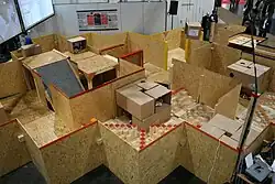 Robots perform 20 minute search and rescue missions in a test arena measuring approximately 10m by 6m, which features a number of obstacle zones designed to challenge autonomous operation, mobility during tele-operation, and object manipulation. Points are allocated based on the number of victims found, the detail with which victims were detected, and the quality with which the arena has been mapped.[2]