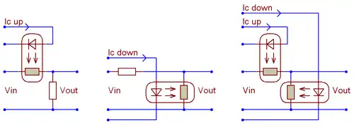 Circuits with defined control voltage of the divider can compensate for the thermal drift of the LED in a RO,[74] but not for the memory effect and thermal drift of the photoresistor. The latter compensation requires a second (reference) photoresistor, which is illuminated by the same light intensity, at the same temperature as the main (modulating) device.[75] Best compensation is achieved when both photoresistors are formed on the same semiconductor chip. The reference photoresistor is included in a divider of stabilized voltage or in a measuring bridge. The error amplifier compares the voltage at the middle point of the divider with the target value and adjusts the controlling current. In the linear controlling regime the RO becomes an analog multiplier: the current through the photoresistor is proportional to the product of the voltage across the photoresistor and the control voltage.[76][77]