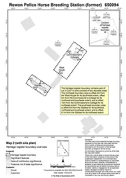- ^ a b c d e f g h i j k l m n o p q r s t u v w x y z aa ab ac ad ae af ag ah ai aj ak al am an ao ap aq ar as at au av aw ax ay az ba "Rewan Police Horse Breeding Station (former) (entry 650094)". Queensland Heritage Register. Queensland Heritage Council. Retrieved 14 August 2021.