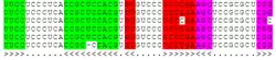 A theoretical ncRNA alignment from 6 species. Secondary structure base pairs are coloured in blocks and identified in the secondary structure consensus sequence (bottom line) by the < and > symbols.