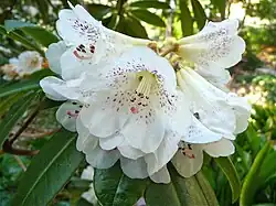 Rhododendron irroratum (露珠杜鹃) is a rhododendron species native to northern Vietnam and western Guizhou, southwestern Sichuan, and northern and southeastern Yunnan, China, where it grows at altitudes of 1,700–3,500 m (5,600–11,500 ft). It is an erect evergreen shrub or small tree growing to 2–4 m (6.6–13.1 ft) in cultivation, but may be double that size in the wild.[1] The leathery leaves are oblanceolate to narrowly elliptic, 7–14 by 2–4 cm in size. The flowers are variable in colour, and may be white or yellowish to violet-rose, but always spotted with greenish or purple flecks.[1]