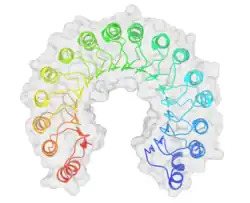 ![]() Top view of porcine ribonuclease inhibitor, showing its horseshoe shape.[1] The outer layer is composed of α-helices and the inner layer of parallel β-strands. The inner and outer diameters are roughly 2.1 nm and 6.7 nm, respectively. | |||||||||||