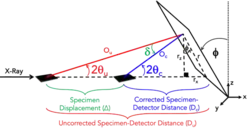 Different correction factors have been developed to account for the specimen-detector displacement in Debye-Scherrer [8] (transmission) and Bragg-Brentano[9] (reflection) geometries. Correction factors have been published for flat tilted and non-tilted 2D detectors as well.[10][11]
