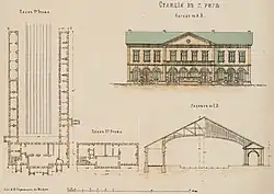 The first railway station in Riga was constructed to serve as the western terminal station of the new railway line from Riga to Daugavpils which was financed by British contractors and led by British engineers. Construction of the station started in 1858, and the ceremony of laying the foundation stone on 21 May 1858 was attended by the Governor-General of the Baltic provinces Alexander Arkadyevich Suvorov. The station opened on 12 October 1861 along with the railway line, which connected Riga with Daugavpils and the Saint Petersburg–Warsaw railway line. The station building was designed by the architect Johann Felsko, and was a small building on two floors with two platforms and four tracks. In addition to railway facilities it also housed a telegraph office, a post office and a police station.[6]