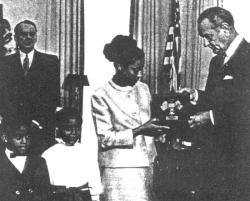 President Lyndon B. Johnson presented the Medal of Honor to Mrs. Eula Pitts and his son and daughter on December 10, 1968. In presenting the award, Johnson declared,