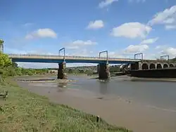Bridges over the Lune include the Devil's Bridge near Kirkby Lonsdale and the Lune Millennium Bridge in Lancaster. At Caton, about 5 miles (8 km) upstream from Lancaster, there is a cluster of three bridges (one stone road bridge and two disused iron rail bridges now used as foot/cyclepaths) at the Crook o' Lune. Here in a 180-degree right-hand bend the Lune turns back on itself; this is followed by a 90-degree left-hand bend forming the shape of a shepherd's crook and creating a beauty spot which was painted by J. M. W. Turner.[14] The M6 motorway crosses the Lune near Tebay and Halton-on-Lune;[15] in 2015 it was joined by the Heysham to M6 Link Road.[16] The Ingleton branch line, a railway operational between 1861 and 1967, followed the Lune between Tebay and Kirkby Lonsdale, crossing the river twice on viaducts which still stand.[17]