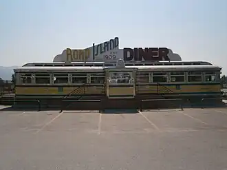 After construction, it was displayed on exhibition at the 1939 World's Fair in New York.[2] After the Fair, It was sold to Al McDermott who had it towed it to Fall River, Massachusetts, where it operated for 14 years. In 1953, it was sold to Greek immigrant Tommy Borodemos, who had it transported down the turnpike to Middletown, Rhode Island, where it operated for four generations as Tommy's Deluxe Diner.[3] It closed in May 2006 and was purchased in 2007 by Utah businessman, Keith Walker, who transported it to Oakley, Utah.[4] After a year of restoration, it was opened in July 2008. It is said to be the only pre-war, Art-deco streamline (constructed to mimic a rail dining car) diner west of the Mississippi River.