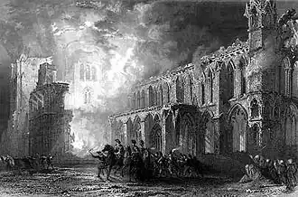 By 1382, Robert II was facing opposition to his rule from powerful segments of the Scottish nobility, most notability the affinity of his eldest son, John, Earl of Carrick, along with various members of the Douglas family.[124] The king was criticized for his controversial promotion of his fourth son, Robert's younger brother Alexander, in the earldom of Ross in 1382.[125] The king secured Alexander's marriage to the widowed Euphemia, Countess of Ross, probably against Euphemia's own wishes.[126] Alexander's usage of cateran warriors to control his lands sparked considerable controversy in Scotland, which also damaged the king's political standing.[127] Meanwhile, a period of developing conflict between Scotland and England led directly to an English invasion of Scotland in 1384.[128] The English army, led by John of Gaunt, the uncle of Richard II of England, devastated the region of East Lothian.[129][130] Robert II was criticized for his response to the English invasion, which was viewed as prevaricating and indecisive.[131] John, Earl of Carrick, the king's eldest son, took advantage of his father's political difficulties to seize power in November 1384.[132] During a general council at Holyrood Abbey, Robert II effectively abdicated much of his authority to his eldest son, who was named as Guardian of Scotland.[133][134][135]