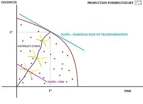 Assume that there are c units of coconut and f units of fish available for consumption in the Crusoe Friday economy. Given this endowment bundle (c,f), the Pareto efficient bundle can be determined at the mutual tangency of Crusoe's and Friday's indifference curves in the Edgeworth box along the Pareto Set (contract curve). These are the bundles at which Crusoe's and Friday's marginal rate of substitution are equal.[1] In a simple exchange economy, the contract curve describes the set of bundles that exhaust the gains from trade. But in a Robinson Crusoe/Friday economy, there is another way to exchange goods – to produce less of one good and more of the other.[5]