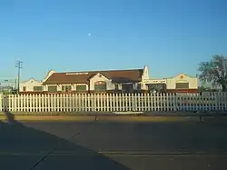 A building which is 195 feet (59 m) long and 26 feet (7.9 m) wide. The building architecture is eclectic, exhibiting both Spanish and Italian influences. The lower section of the exterior wall is brick, while there is covered with stucco. The stucco is painted white, decorated with tan painted trim. The center section has a gabled roof, with semicircular walls extending above the roof line on each end. The large window in the center is arched. Other windows have an arch design embedded in the stucco.
