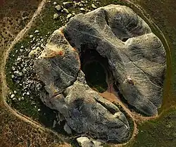 Painted Rock is a free-standing rock on the Carrizo Plain near the Sierra Madre Mountains at the southern tip of the Great Central Valley.[1] The interior alcove of the horseshoe-shaped rock features pictographs by Chumash, neighboring tribes, and non-Native Americans.