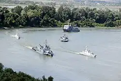 The Flotilla comprises three Mihail Kogălniceanu-class river monitors and five Smârdan-class armored patrol ships (Vedete Blindate Fluviale).[45][46] Other ships include 12 VD 141 patrol boats (Vedete Dragoare - minesweeper patrol boats)[47] and two ESM12 fast intervention motorboats.