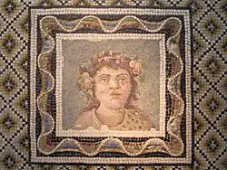 The iconography of Aphrodite and Adonis as a couple is often hard to distinguish in Greek art from that of Dionysus and Ariadne.[111] In contrast to Greek depictions of the couple enjoying the luxury and delight of love, Roman paintings and sarcophagi almost always frame their love at the moment of loss, with the death of Adonis in Aphrodite's arms posing the question of resurrection.[112] At Madaba, an Imperial city of the Province of Arabia in present-day Jordan, a series of mythological mosaics has a scene of Aphrodite and Adonis enthroned, attended by six Erotes and three Charites ("Graces"). A basket of overturned roses near them has been seen as referring to the Rosalia.[113]
