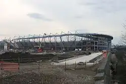 In January 2010 the club announced that their new stadium, later named the AESSEAL New York Stadium, would be built on the former Guest and Chrimes foundry site in Rotherham town centre.[34] Preparation work on the site began in February 2010 to make way for the foundations to be put in place and for the old factory to be knocked down to make way for the stadium. Construction started in June 2011 and the first game played at the stadium was a pre-season match between Rotherham and Barnsley, held on 21 July 2012.[35] The Millers won 2–1; the first goal in the stadium was scored by Jacob Mellis of Barnsley, and David Noble scored Rotherham's first goal in their new home.[35] The New York Stadium made its league debut on 18 August 2012, in which Rotherham beat Burton Albion 3–0,[36] Daniel Nardiello scoring the first competitive goal in the ground.[37]