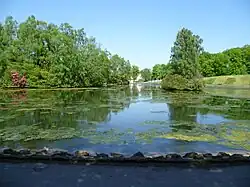 The glen has many of the typical features of an Edwardian urban park, such as a boating pond started in 1923 by Sir Robert McAlpine to replace a former curling pond. Rouken Glen includes a large waterfall on the Auldhouse Burn surrounded by steep woodland; the waterfall is based on a natural waterfall, doubled in height to form a reservoir to supply the printworks downstream at Thornliebank during the early 19th century. There is a walled garden in the grounds of the former manor, Thornliebank House (demolished 1965).[5]