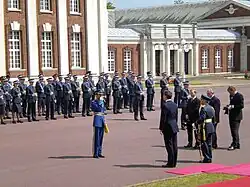 In addition to the many British officer cadets who have passed through Cranwell, graduating cadets have come from many countries around the world, including Bahrain, Iraq, Oman, Qatar, Pakistan, Sri Lanka, Trinidad and Tobago and Paraguay.[27][28][29][30] RAFOTA also provides Specialist Officer Initial Training (SOIT) courses for medical and dental officers, chaplains, legal officers and nursing officers, and for officers rejoining the Service or transferring from the sister services.[25] A small number of short induction courses cater for warrant officers selected for commissioning, university cadets, bursars and Volunteer Reserve officers. In addition, RAFOTA delivers a 2-week Reserve Officer Initial Training course for Full Time Reservists, Royal Auxiliary Air Force (RAuxAF), Mobile Meteorological Unit and Reserve Officers.[25] The College awards the Sword of Honour to the most outstanding student officer of the year.[31]