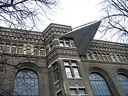 The eastern wing facing Queen's Park was designed by Alfred H. Chapman and James Oxley. Opened in 1933, it included the museum's elaborate art deco, Byzantine-inspired rotunda and a new main entrance. The linking wing and rear (west) façade of the Queen's Park wing were originally done in the same yellow brick as the 1914 building, with minor Italianate detailing. This façade broke away from the heavy Italianate style of the original structure. It was built in a neo-Byzantine style with rusticated stone, triple windows contained within recessed arches and different-coloured stones arranged in a variety of patterns.[33] This development from the Roman-inspired Italianate to a Byzantine-influenced style reflected the historical development of Byzantine architecture from Roman architecture. Common among neo-Byzantine buildings in North America, the façade also contains elements of Gothic Revival in its relief carvings, gargoyles and statues. The ornate ceiling of the rotunda is covered predominantly in gold back painted glass mosaic tiles, with coloured mosaic geometric patterns and images of real and mythical animals.