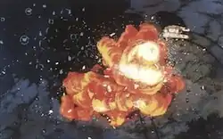 Critiquing his own work on Royal Space Force, Ogura expressed a wish that he had been able to convey more emphasis on the effects of light and shadow in addition to color, but joked that it was hard to say exactly how things would turn out until he actually painted them, something he said was true of the entire film.[132] Ogura remarked that many of his team were veterans of Sanrio's theatrical films unit, which gave him confidence in their abilities; mentioning the role of former Sanrio artist, future Gankutsuou art director Hiroshi Sasaki,[133] in the visionary sequence occurring after Shirotsugh's orbiting spacecraft crosses from the world's nightside to its dayside, referred to in production as its "image scene."[134] Akai discusses the involvement as well in this sequence of the future director of Gankutsuou, Mahiro Maeda.[135] Okada judged that the image scene was the only place in the film appropriate to the talent of Maeda, whom he called a "true artist." Anime, Okada argued, was like a reactor that harnessed Maeda, whose artistic talent Okada compared to that of a nuclear blast, for the mundane purpose of boiling water; he asserted that when Maeda had worked before Royal Space Force on Castle in the Sky, not even Hayao Miyazaki had been able to employ his talent properly.[136]