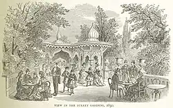 The gardens were used for large public entertainments from 1837, such as re-enactments of the eruption of Mount Vesuvius, the Great Fire of London, or the storming of Badajoz, using large painted sets up to 80 feet (24 m) high, and spectacular firework displays, as had become popular at Vauxhall Gardens before its demise. Later, it was used for promenade concerts. The gardens suffered intense competition from the Great Exhibition at the Crystal Palace in 1851.[1][2]