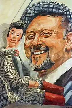 - Toone VII: José Géal (born 1931), comedian, he discovered the Toone Theatre and founded his own company. When Toone VI stopped performing in 1963, exhausted by the difficulties encountered in safeguarding this folklore, José Géal officially replaced him as Toone VII. As he could not find an ideal location to set up his theatre in the Marolles, he moved to the current building, a stone's throw away from the Grand-Place. In 1971, the City of Brussels bought this building to help Géal keep his puppets alive.[8] Far from looking towards the past, Toone VII opened up the Royal Theatre Toone to Europe and to the world by updating the repertoire and translating his shows into English, but also into Spanish, Italian and German (always interspersed with the Brusselian dialect), thereby attracting new audiences. Tourists, students, the regulars and the curious are now replacing the marollien spectators.[2][3] He was made Officer of the Order of Leopold in 2004.[17]