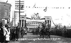 The Canadian portion of the tour was originally planned to begin in British Columbia, proceeding eastward through the country. However, after South Africa was added onto the royal tour, the decision was made to begin to the royal tour in Quebec City, and conclude it in Halifax.[76] As the period of court mourning for Queen Victoria's death had not yet expired during their time in Canada, public balls, banquets, and levees planned for the royal tour were cancelled, with only official dinners, concerts, receptions, and reviews taking place.[78] During the tour, Prince George kept a methodical record of his activities, recording that he shook the hands of 24,855 people at official receptions; received 544 addresses; laid 21 cornerstones; gave 100 speeches; and presented 4,329 medals.[79]