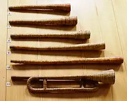 A rozhok is a conical straight tube with the six playing holes: five on top and one underneath. The total length of a rozhok ranges from 320 to 830 mm (13" to 33"). A mouthpiece is cut in the form of a small cup, and the lower end of the tube is shaped like a conical bell. A rozhok is usually made of birch (mostly birch bark), maple, or juniper. In the past they were made in two halves fastened together with birch bark; today they are turned.[3] The sound of a rozhok is strong, but mellow, having a range of about an octave, or a little more. There are several types of rozhoks: the shortest one, having the highest sound is called vizgunok (squeaker), typically in F# or G; the longest and thus the lowest one is called bas (bass), in F# or G an octave below, while a mid-size instrument is called a polubasok (half-bass), typically in C. It is polubasok instruments that are most frequently used for solo playing. Rozhok ensembles usually consist of just vizgunok and bas instruments in the ratio 2:1 (twice as many high-pitched horns).