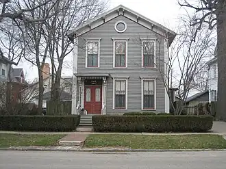The historic significance of the home is in its association with Ruben M. Benjamin, who lived in it for more than 60 years until his death in 1917.[2][6] Benjamin was raised in Chatham Center, Columbia County, New York. He graduated from Kinderhook Academy and then Amherst College and eventually attended Harvard law school for a year. He ended up in Bloomington in 1856. When Benjamin passed the bar exam in 1856, Abraham Lincoln served as his examiner.[4][6] After passing the bar, Benjamin married and practiced law with various Bloomington lawyers, such as Asahel Gridley and Thomas F. Tipton. In 1869, Benjamin was elected to the Illinois state constitutional convention, where he distinguished himself as a leader. During the convention Benjamin strongly advocated language allowing the regulation of the freight industry. The clauses he supported were included in Article XI of the Illinois Constitution.[4]