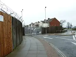 The area used to be a residential area,[1] mainly catering for employees of the naval dockyard and their families. It was heavily damaged by bombing during World War II. In the late 1960s and early 1970s much of the area was cleared to make way for the M275 motorway and Portsmouth International Port. The parish church was St John the Baptist,[2] and is now flats.[3] The church was completed in 1916 and suffered bomb damaged in world war two.[4] Repair work took place in the 1950s and 1960s before it was converted into flats in between 1986 and 1987.[4]