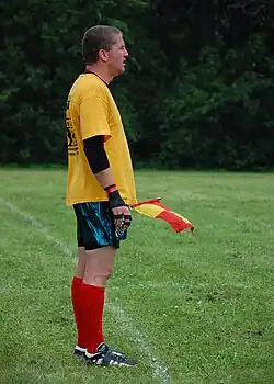 Also required in the perimeter area are a set of 14 flag posts, each with a minimum height of 1.2 metres, marking the intersections of certain lines or other nominated distances. These are generally a plastic pole on a spring loaded or otherwise soft base, sometimes with a flag on top, covered in foam padding. Others may be moulded plastic or disposable cardboard. At lower levels, these flags may not be used, but are still specified in the Laws. Flags are placed as follows: