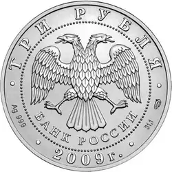 The coin was designed and sculpted by A. V. Baklanov and minted at the Saint Petersburg Mint and the Moscow Mint.[1] The 2006-2016 obverse features the emblem of the Central Bank of Russia—a double-headed eagle with wings down. This emblem was the same one used by the Russian Republic in 1917. Both obverses are inscribed with "БАНК РОССИИ" (Bank of Russia), "ПЯТЬДЕСЯТ РУБЛЕЙ" (Fifty rubles), indications of the precious metal content and its fineness, and the year of issue followed by the mint mark. M is the mint mark for the Moscow Mint and C-П is for the St. Petersburg Mint. From 2017 forward, The double-headed eagle version was replaced with the current Coat of arms of Russia. The top of the coin is inscribed with "РОССИЙСКАЯ ФЕДЕРАЦИЯ" (Russian Federation). This version of the obverse was designed by E. V. Kramskaya.[2]