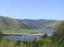 The Russian River (Southern Pomo: Ashokawna, Spanish: Río Ruso) (Russian: русская река) is a southward-flowing river that drains 1,485 sq mi (3,850 km2)[4] of Sonoma and Mendocino counties in Northern California. With an annual average discharge of approximately 1,600,000 acre feet (2.0 km3),[6] it is the second-largest river (after the Sacramento River) flowing through the nine-county Greater San Francisco Bay Area, with a mainstem 115 mi (185 km) long.