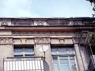 Ryndzyun's house was built in the style of the southern Russian eclecticism which was lost over time.[2] The key element of the facade decoration was stucco molding which was a lot.[5] On the first two floors of the house there was a clinic and on the third there lived a doctor with his wife and four children.[5] The facade of the house was decorated with a brick, which was produced by the manufacturer Epifanov who was the owner of a profitable brick manufactory.[5] All the bricks at his enterprise were made by the method of manual molding. Not only the demolished house represented historical and cultural value, but also the site and the area where the former hydropathic institution was located.[1]