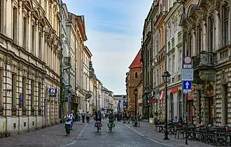 The oldest document recording the street's existence originates from 1307 under the name Slacovse gasse.[1] Formerly, the northern point of the street was enclosed by the Sławkowska Gate and a bulwark. During the urban modernisation of Kraków (1817–1822), the city walls and the gatehouse were deconstructed. The street ends by the Planty Park with Basztowa Street (Ulica Basztowa, lit. Tower Street), where it continues as Długa Street (Ulica Długa, lit. Long Street).[2]