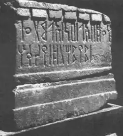 There are various royal inscriptions in South Arabian script and the Sabaean language that mention Dʿmt, the title mlk (king), and mkrb, most often interpreted as the Sabaean title mukarrib (or possibly the honorific makrûb meaning "blessed". There is also the unknown mlkn ṣrʿn).[11][12] There are seven inscriptions that mention Dʿmt, all found in Aksum or eastern Tigray Region (none at Yeha or in Eritrea), however it is unclear whether they had been moved from their original locations. There are inscriptions naming non-Dʿmt rulers at Seglamen, Kaskase, and Yeha.[10]: 38 Two inscriptions mention sbʿ, considered to refer to a geographical region or tribe/polity, or to Sheba (or a personal name).[2][13] Some inscriptions on votive altars near Yeha also mention individuals from Sheba. Inscriptions also mention the Sabaean deities Almaqah and ʿAṯtar and indigenous ones.[3]: 91 [10]: 40 Of the 11 deities mentioned, 5 are South Arabian.[1] One inscription is from a Sabaean stonemason from Marib, and another on an altar indicates the Great Temple of Yeha was dedicated to Almaqah.[9] Some inscriptions divide the population into "reds" and "blacks",[2] possibly referring to skin colour.[14]: 130 Inscriptions in Sabaean are fragmentary and total 40 words, most of which are names. From a palaeographic perspective, they appear to not have been the earliest ones. Other inscriptions that could be linguistically analysed are Ethiopic in form, which are more numerous and have been labelled Proto-Geʽez.[10]: 37–8